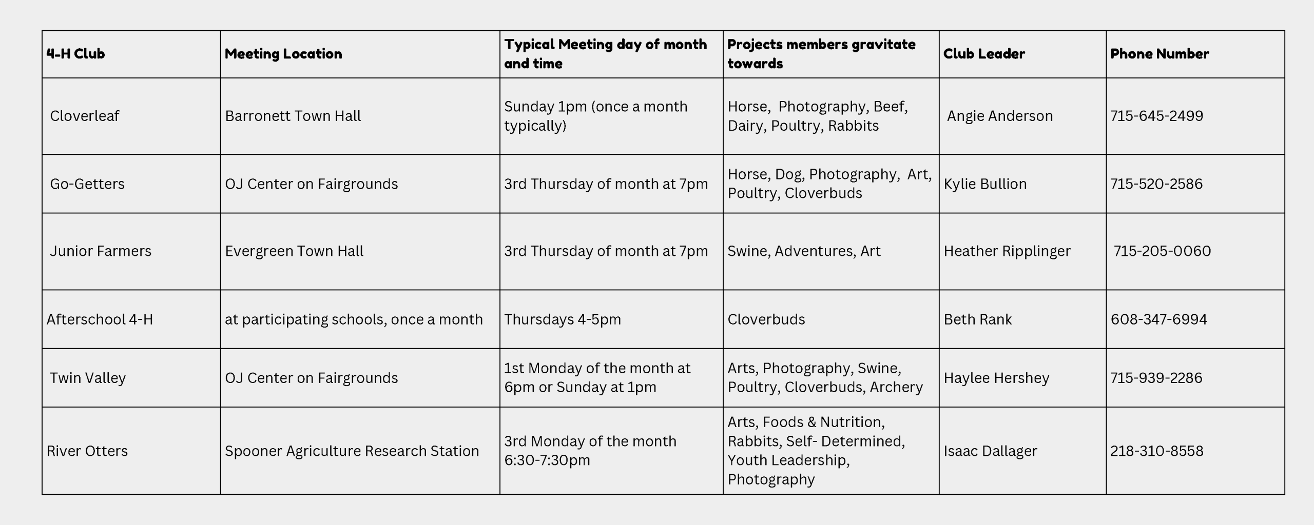 If you know what club you want to join and what projects you want to enroll in, you can enroll in 4-H through 4-H online at wi.4honline.com and complete the steps. If you’re not sure where to begin. Please contact Beth Rank at beth.rank@wisc.edu or Amy Costello at acostell@co.washburn.wi.us or call the office at 715-635-4H4H.