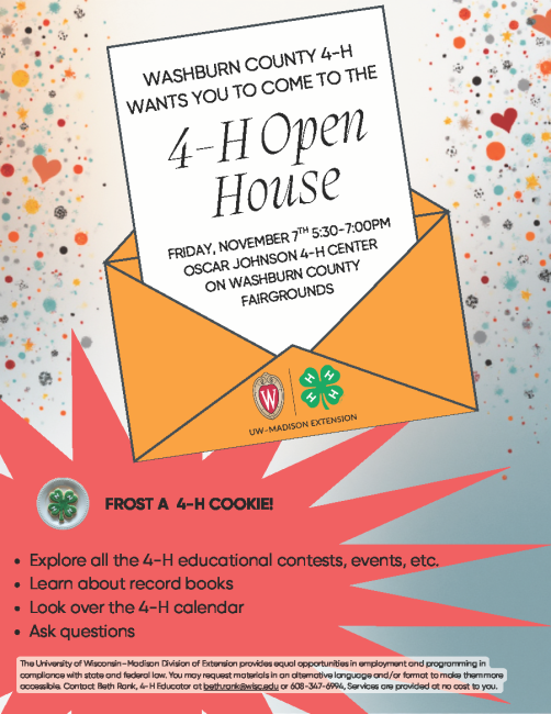 Washburn County 4-H is having an Open House! Join us Friday, November 7th from 5:30 p.m. – 7:00 p.m. at the Oscar Johnson 4-H Center on the Washburn County Fairgrounds. Come and frost a cookie, explore all the 4-H educational contests, events, etc., learn about record books and ask questions. Bring a friend or several to learn about 4-H. See you there!