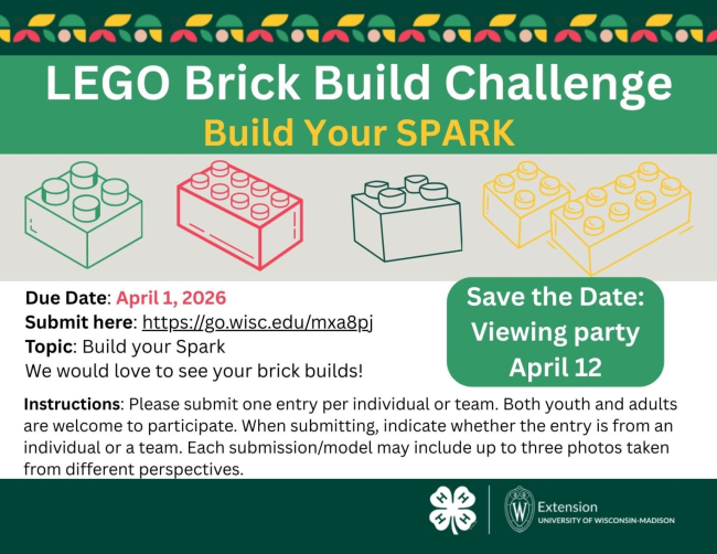 In 4-H, a “spark” is that special interest or passion that makes you come alive. Whether it’s science, art, animals, or sports, we want to see you represent your passion using nothing but bricks!